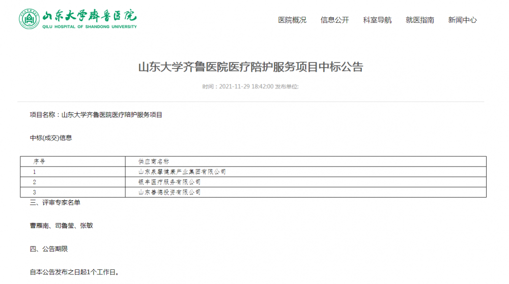 自2019年公司正式提出“立足醫(yī)院,走出院外”的戰(zhàn)略方針后,陪護(hù)業(yè)務(wù)堅持以此為指導(dǎo),蓄勢待發(fā),尋找外拓機會。11月11日,齊魯醫(yī)院官網(wǎng)公開《山東大學(xué)齊魯醫(yī)院醫(yī)療陪護(hù)服務(wù)項目采購公告》,引起公司高度重視,相關(guān)部門通力合作,趕制標(biāo)書順利投標(biāo);11月29日,齊魯醫(yī)院官網(wǎng)發(fā)布《山東大學(xué)齊魯醫(yī)院醫(yī)療陪護(hù)服務(wù)項目中標(biāo)公告》,善德公司成功入圍。次日,公司副總經(jīng)理喬龍攜項目人員參加由齊魯醫(yī)院護(hù)理部組織的無陪護(hù)病區(qū)培訓(xùn)會,通過抽簽的方式確認(rèn)了善德陪護(hù)服務(wù)范圍為華美樓。此后項目人員緊急考察環(huán)境,部署工作,并對護(hù)理員集中培訓(xùn)、分組,積極對接入駐事宜,于12月6日正式入駐齊魯醫(yī)院肝膽外科、普外科六區(qū),開啟新的工作篇章。