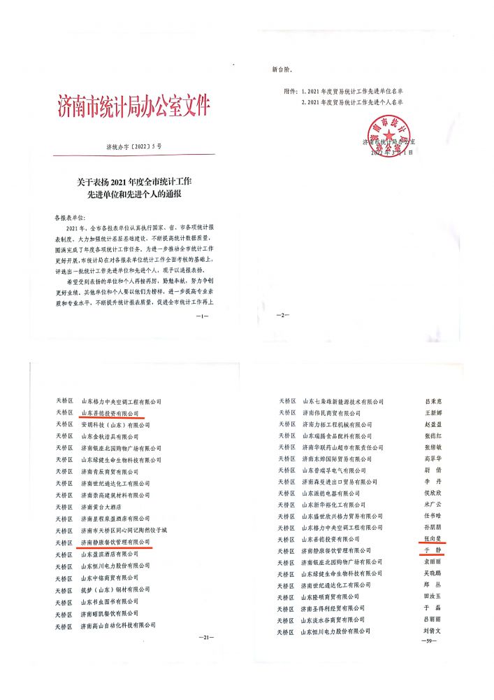 近日,濟(jì)南市統(tǒng)計(jì)局印發(fā)了《關(guān)于表?yè)P(yáng)2021年度全市統(tǒng)計(jì)工作先進(jìn)單位和先進(jìn)個(gè)人的通報(bào)》,山東善德投資有限公司及其子公司濟(jì)南靜康餐飲管理有限公司均被授予“2021年度全市統(tǒng)計(jì)工作先進(jìn)單位”榮譽(yù)稱號(hào)。公司財(cái)務(wù)部張向斐、于靜獲得“2021年度全市統(tǒng)計(jì)工作先進(jìn)個(gè)人”榮譽(yù)稱號(hào)。