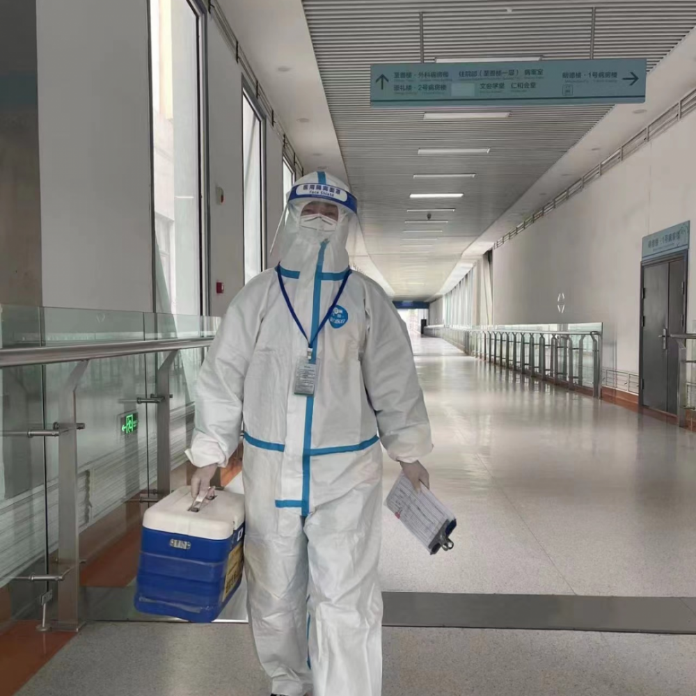 自4月26日以來,孫輝負責的就是核酸標本轉運的工作,每天身著隔離衣,用最快的速度,穿梭在核酸檢測門診和檢驗科之間,轉運核酸標本。