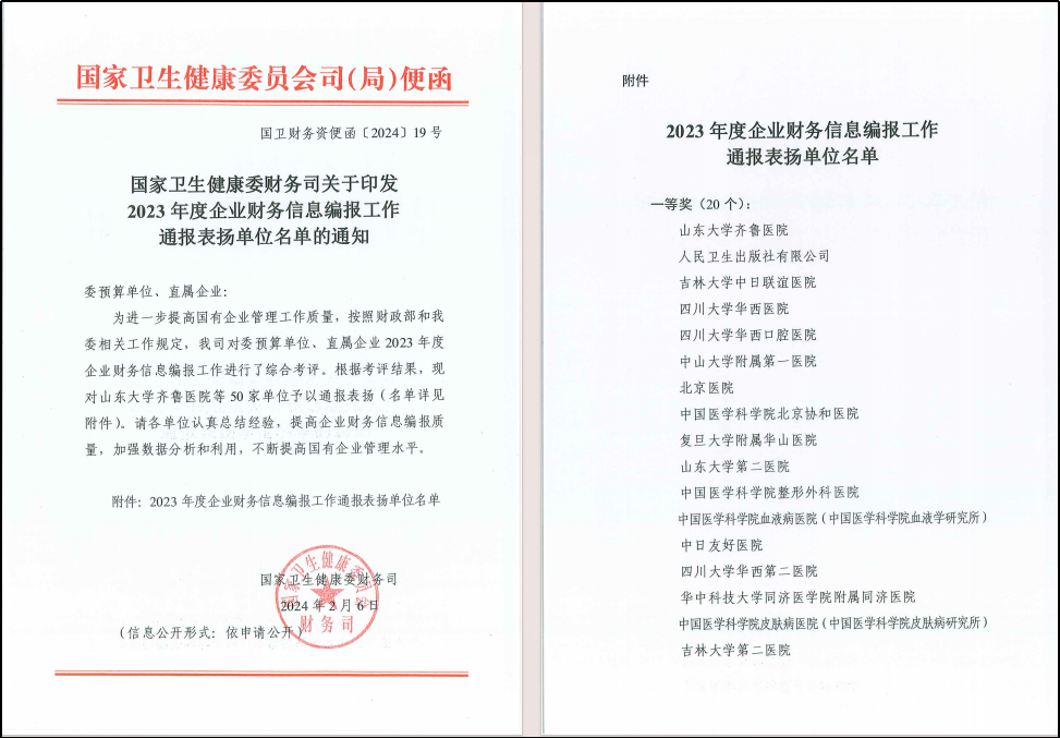 近日,國家衛(wèi)生健康委對2023年度企業(yè)財(cái)務(wù)信息編報(bào)工作成績突出的預(yù)算單位予以通報(bào)表揚(yáng),公司榮獲一等獎。